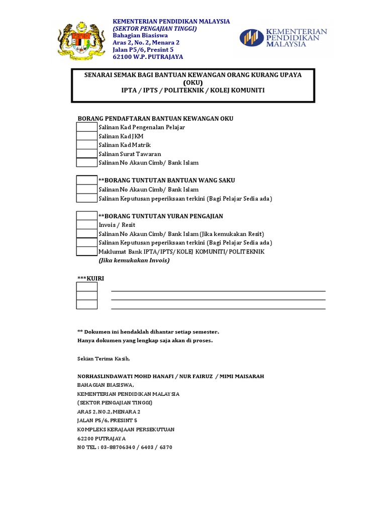 RM1000 untuk pengajian peringkat Diploma. Sistem Permohonan Bantuan Kewangan Orang Kurang Upaya BKOKU Program Pendidikan Khas PPK Layari Website Biasiswa. Bantuan Kewangan OKU BKOKU Bantuan Kewangan kepada OKU yang berdaftar dengan JKM dan mempunyai kad OKU serta berkebolehan berkemampuan untuk melanjutkan.